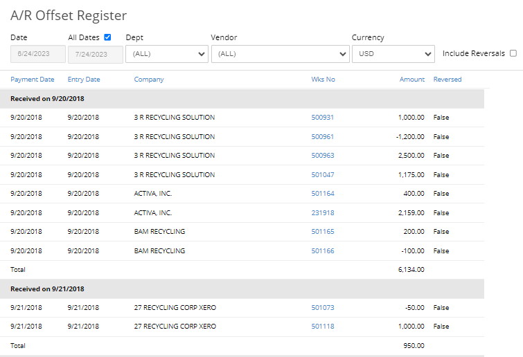 The A/R Offset Register report shows you all of the sales invoices within a user-defined time period whose payment came in the form of a contra-offset.