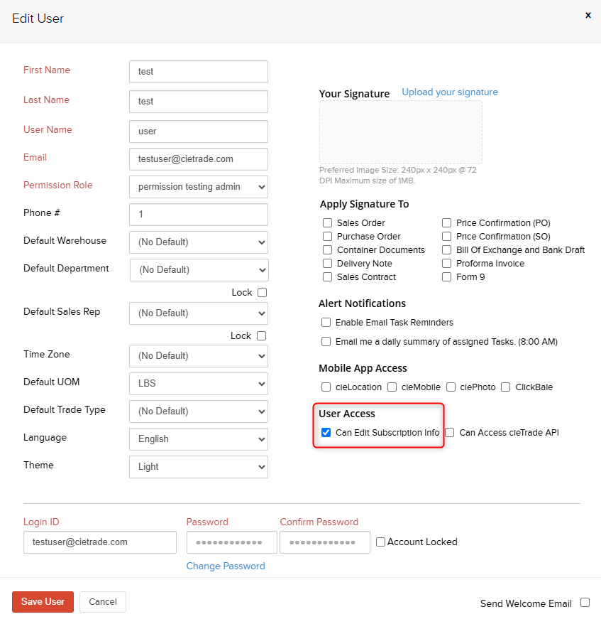 - Under User Access, check off "Can Edit Subscription Info" to allow them to access the Subscription portal and update payment information.