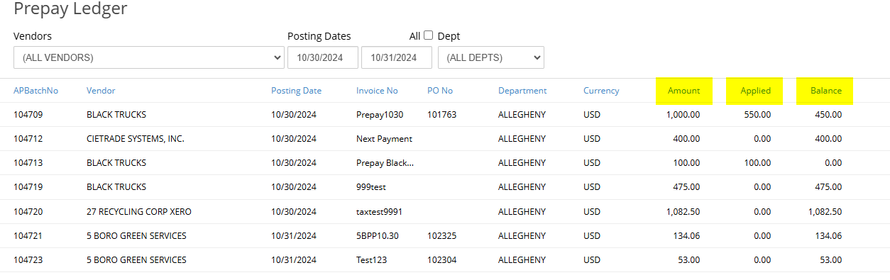 On the inquiry, you have the ability to view the total prepayment Amount, the amount Applied and the remaining Balance. You can also drill down on applied prepayments to view the corresponding worksheets.