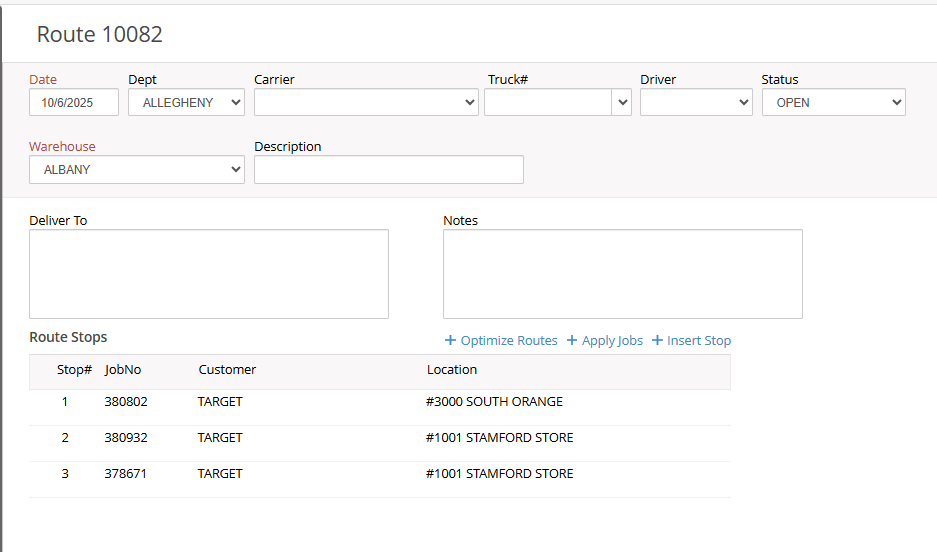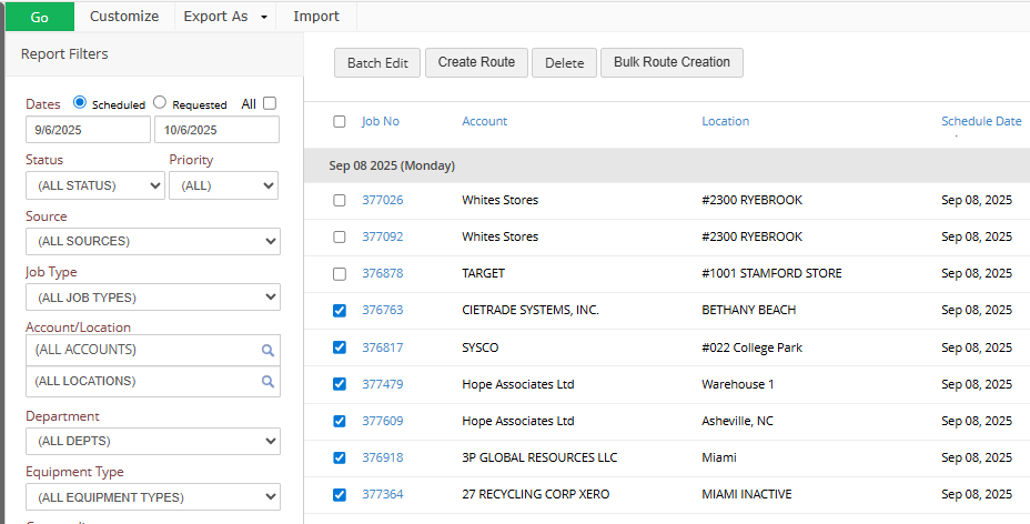 NOTE: the receiving location must be the same for all tickets to create a route.