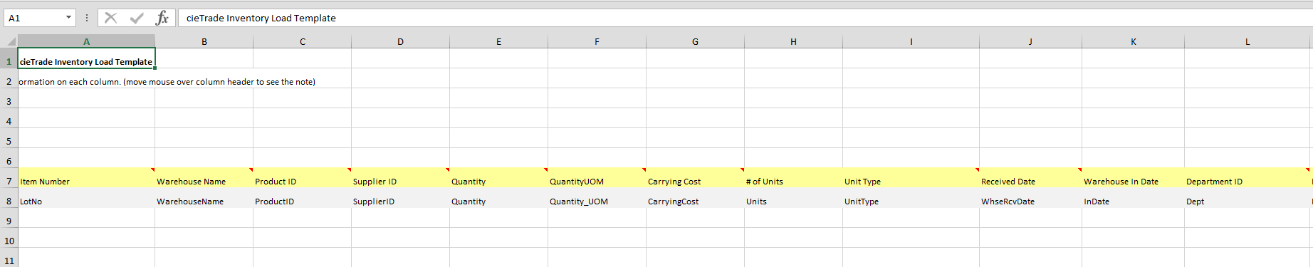This guide provides instructions for uploading existing serialized inventory into cieTrade using the provided Inventory Import Template. This process is intended for importing inventory items that already exist in your warehouse, including their serial numbers, carrying costs, and other relevant details.