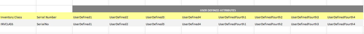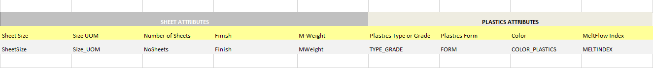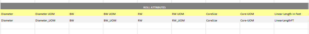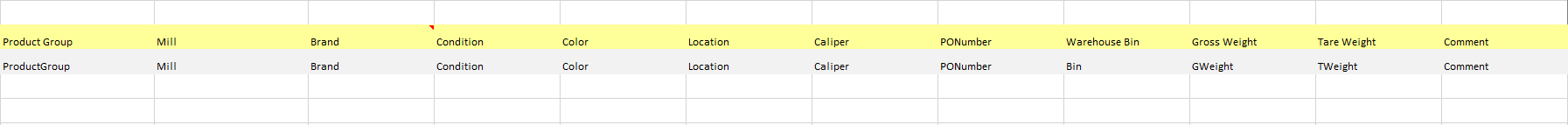 Product Category, Product Group, Mill, Brand, Condition, Color, Location (in your warehouse), Caliper, PO Number, Warehouse Bin, Gross Weight, Tare Weight, Comment, Diameter, Diameter UOM, BW, BW UOM, RW, RW UOM, Core Size, Core UOM, Linear Length in Feet, Sheet Size, Size UOM, Number of Sheets, Finish, M-Weight, Plastics Type or Grade, Plastics Form, Color, Melt flow Index, Inventory Class, Serial Number, User Defined 1-4.