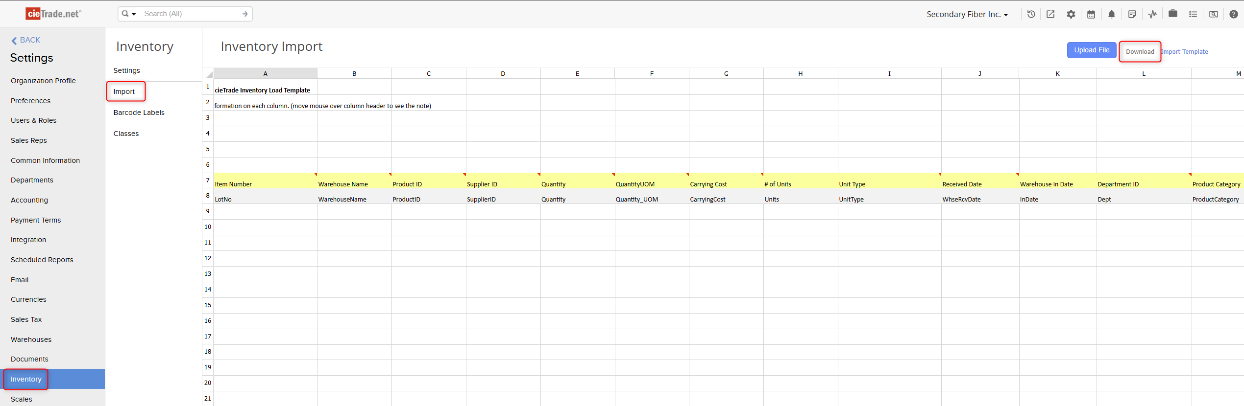 To get to the inventory upload, navigate to settings > inventory > import and choose to download the template. Downloading will allow you to save the template to your computer.