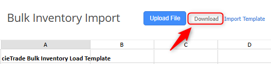 - Process: click the Download Template button to download an excel file which will mirror the shown spreadsheet. The bulk inventory information can be added directly into the excel file, which will then need to be uploaded.