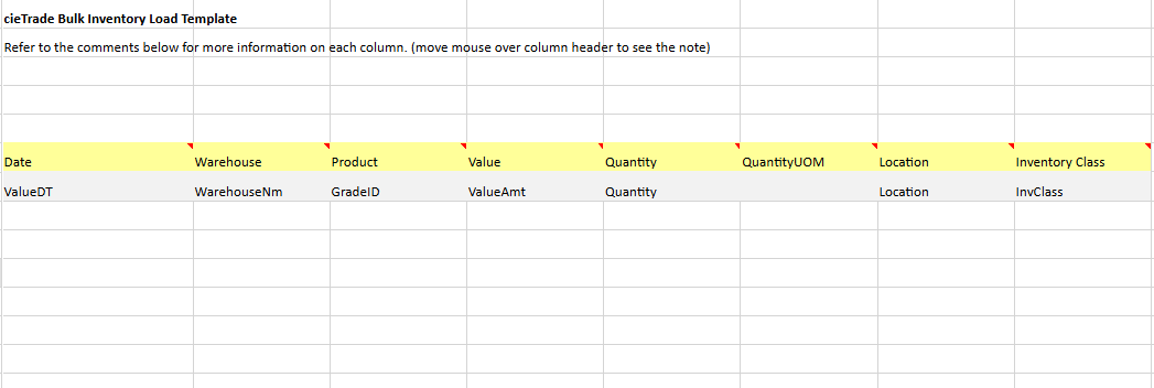 NOTE: Both the spreadsheet in cieTrade and the exported file will contain comments in the column headers which will provide more information of the data the field is looking for, and the format it needs to be in. In addition, whether or not this is a required or optional field will be noted.