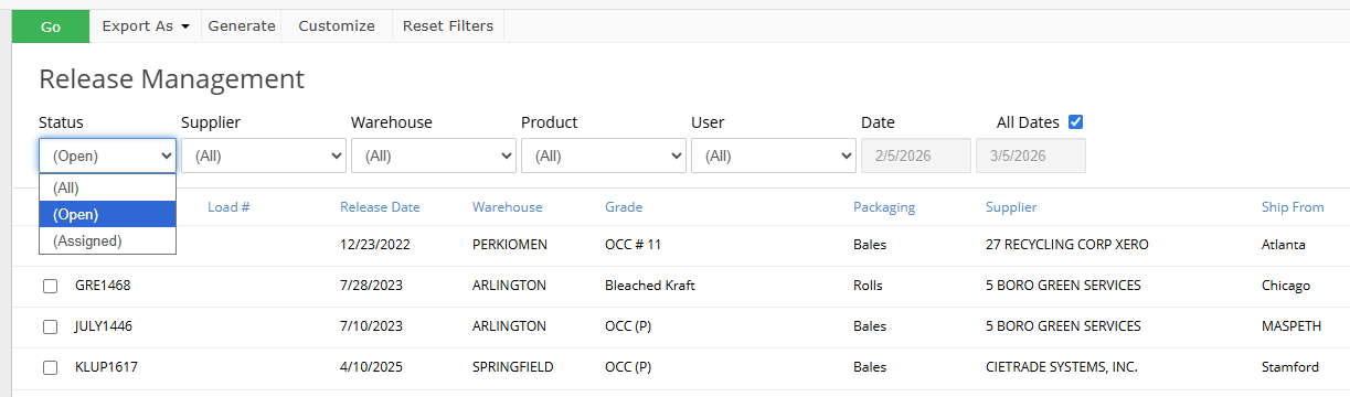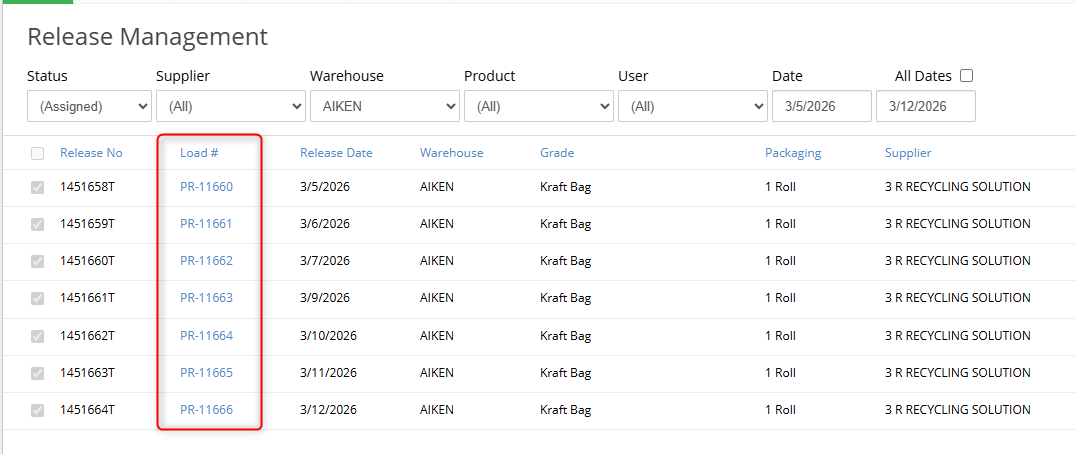 4. Once you click Create, these releases will be moved from OPEN to ASSIGNED in the Status drop down, indicating that they have been fulfilled. You can view the associated Receiving ticket numbers in the Load # column.