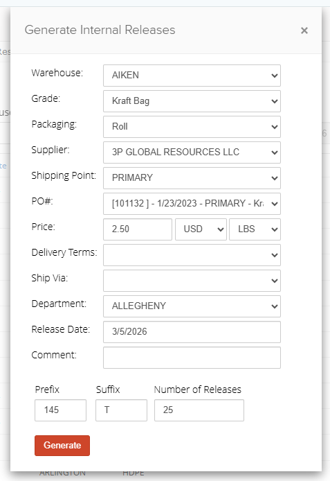 3. Click Generate at the top of the screen. This will pop up a form to enter the details about the block of releases.