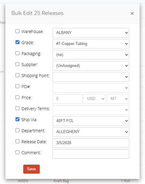 4. Click on the Bulk Edit button to change details about these releases. You can update the supplier and linked order at this point by checking next to the field you want to change, and entering the new information as needed before clicking Save.