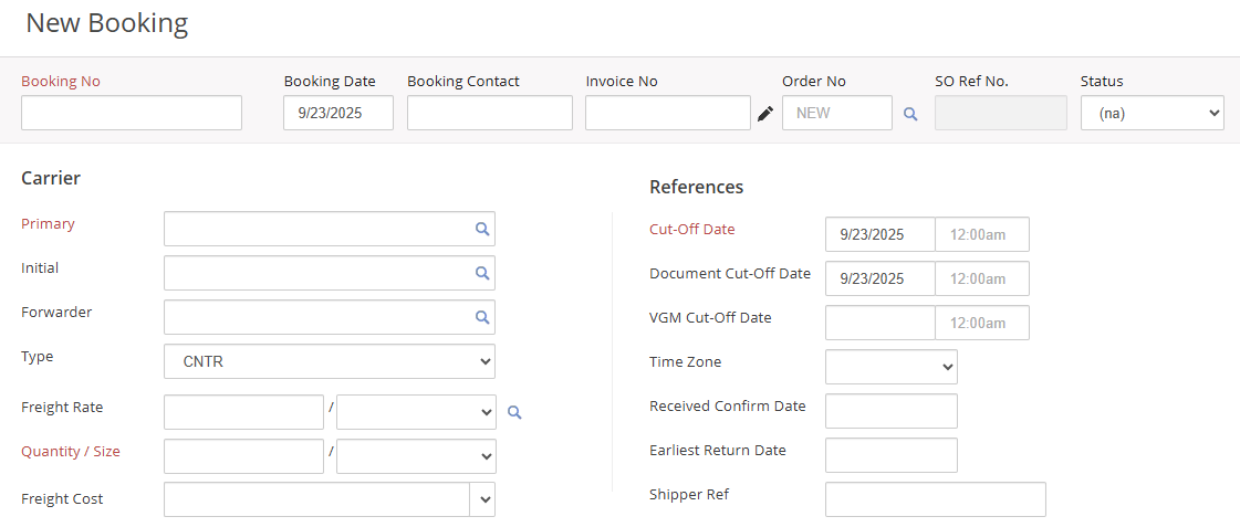 In the new Booking form, enter the Booking number in the Booking No. field. Make sure the booking number is correct before the Booking is saved. Once it is initially saved, the Booking number cannot be changed.