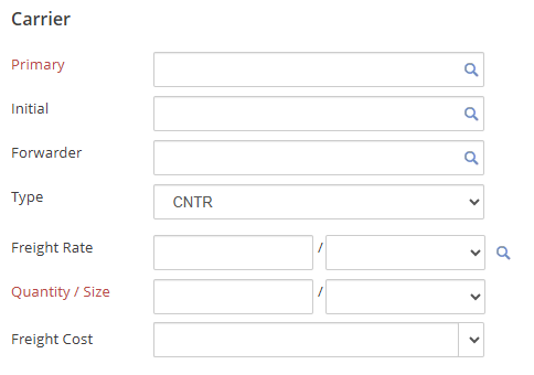 Freight Rate is where you can input stored ocean freight rates for the Primary carrier. Select a stored rate using the spyglass icon. For further information on storing Ocean Freight rates, visit the helpfile here.