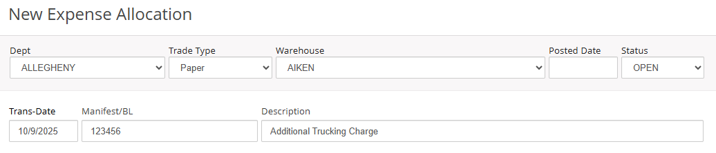 - To use this feature, the Warehouse drop-down menu located at the top of the Expense Allocation form must be set to the desired warehouse.