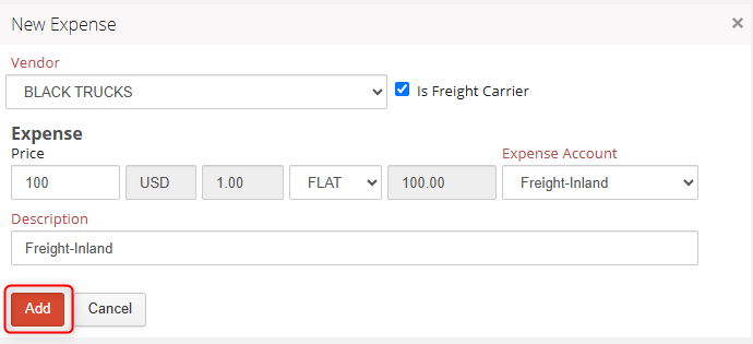 - Use the drop-down provided to select the Vendor invoicing for the expense. If the selected Vendor is a Freight Carrier, the checkbox will be populated.