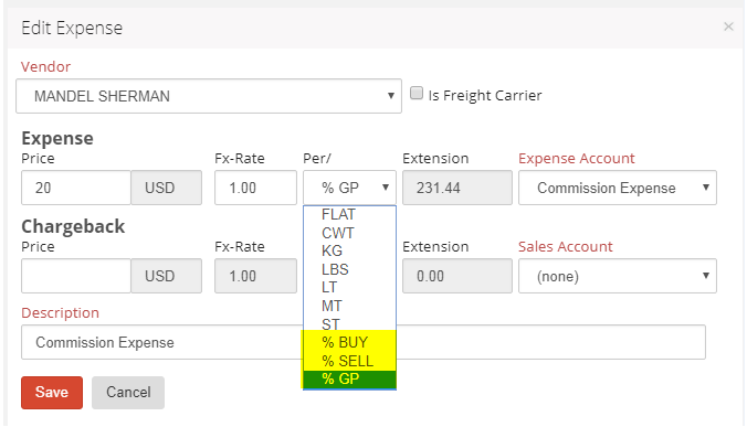Users can also use the Expense field to enter commission expenses as a percentage of either the buy/sell total or the gross profit of the total load.