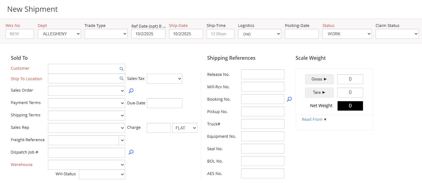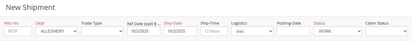 Use the Warehouse drop-down menu to select the location where the material is being received. To use this in tandem with the Warehouse module for plants and processing facilities, select the WH-Status. If this is a Container for Export workflows, set the Warehouse to (Container), which will change the Shipping References.