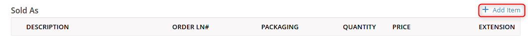 The Sold As section contains the products that the Customer is buying. If you have attached a Sales Order to the Shipping worksheet, it will automatically populate with the products from the Sales Order. If no Sales Order has been linked or if you need to add additional products, click the + Add Item button provided.