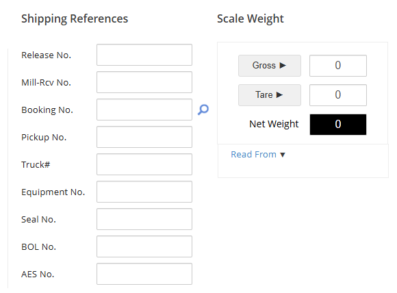 The Shipping References section is used to enter additional details about the load, such as your Customer's provided Release No. or Mill-Rcv No., the Booking No. and look up, Pickup No., Truck #, Equipment No., and/or the BOL No. related to the shipment.