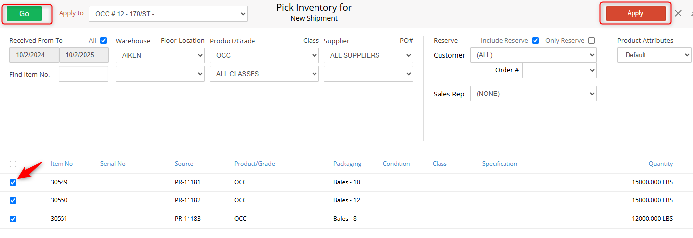 From the list of results, select the inventory item(s) being pulled for this shipment by checking the checkbox to the left of the Item No and click the Apply button.