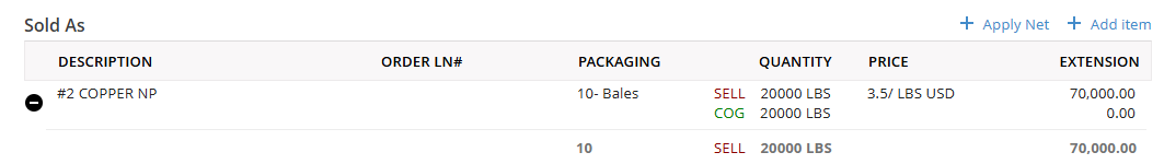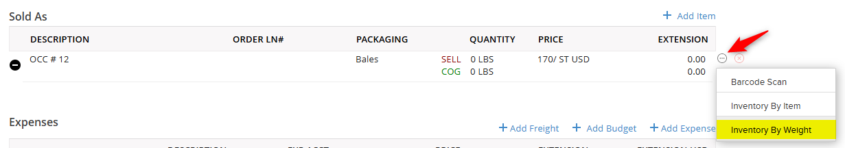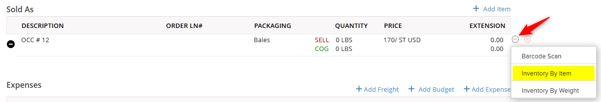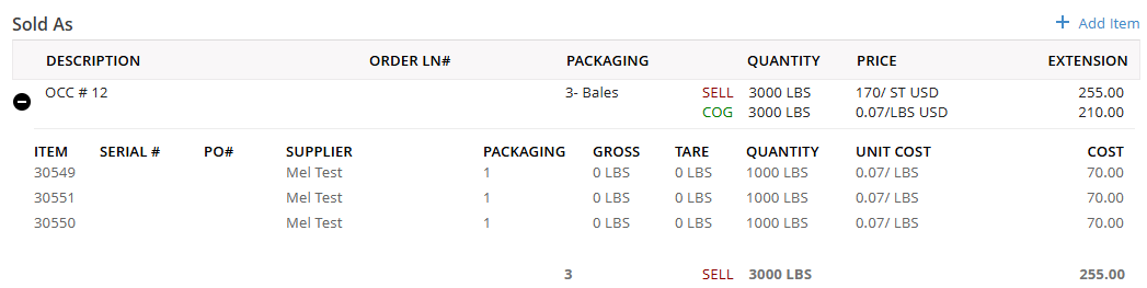 The selected inventory items will be added underneath the Sold As item that they were applied to while you are in the edit screen. To collapse this view, click on the black circle icon to only see a roll up by that Sold As item. At the top of each Sold As item, there will be a totaling line of the weights, packaging, and extension. The Sell is the amount you are selling these inventory items for. The COG line or 'Cost of Goods Sold', or a reflection of what you paid for that material to give you a gross profit for the load.
