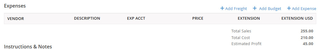 The Expense section is used for adding additional expenses, such as the cost of freight. Once the expense is saved, the cost will factor into the profitability calculation on the Profit Snapshot found on the Shipping Worksheet.