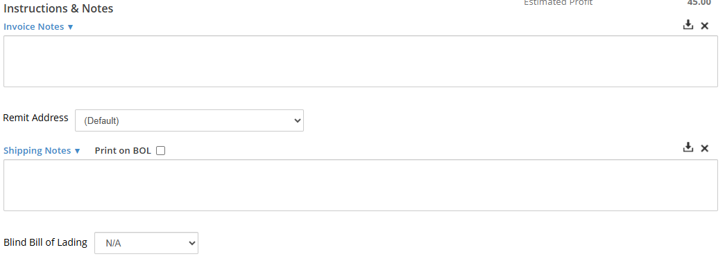 The Shipping Notes field allows for further information about the shipment to be entered. These notes can be included on the BOL by clicking the Print on BOL checkbox.