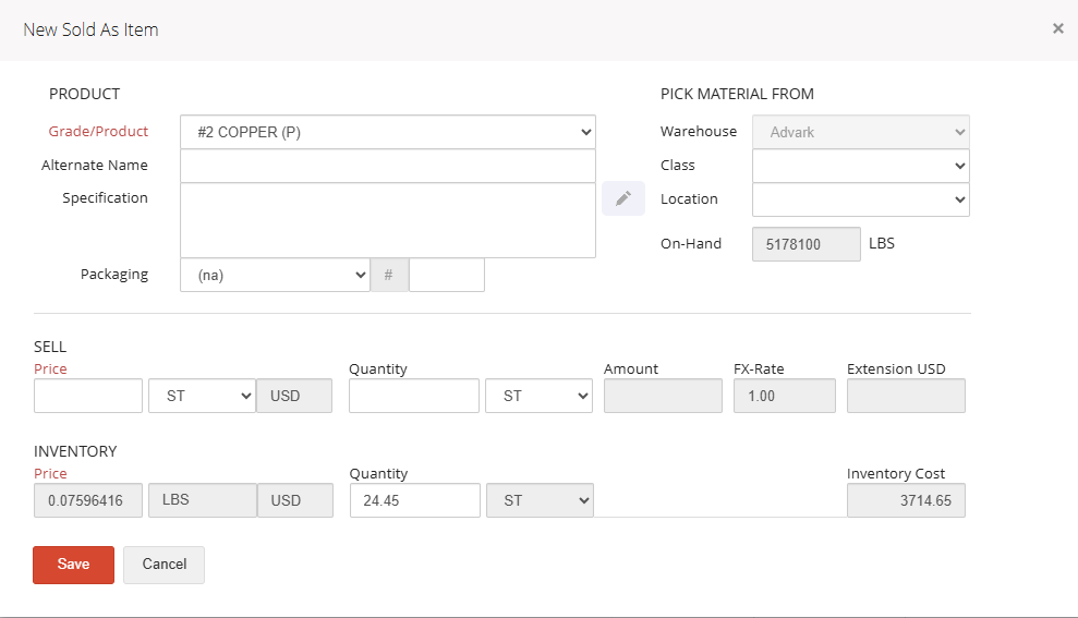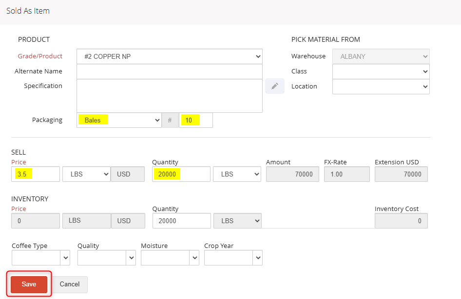 Packing bulk-non perpetual inventory does not require packing inventory by item or inventory by weight. Simply enter the product, quantity, price, and packaging being sold using the + Add Item button on the Sold As line and click Save.