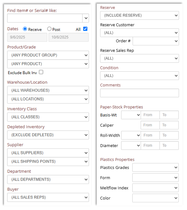 The reporting filters give you the flexibility to search for a product using multiple attributes. You can manipulate the report by selecting a Product/Grade, searching within a specific Date Range, the Warehouse and Location, the Buyer/Sales Representative, the Inventory Class, a Supplier, a Department, a Buyer, a Condition, or even searching by one or more Paper-Stock Properties or Plastic Properties of a particular roll of paper. You also have the ability to include or exclude Depleted Inventory and Reserved Inventory.