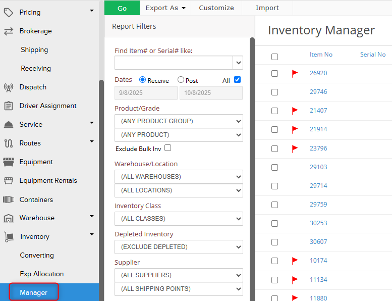 The Inventory Manager is a tool that allows you to view all available and uncommitted products. Once a product has been placed into inventory, it will appear under this management tool. Alternatively, if products are shipped out, they cease to appear here, unless you search by the Depleted inventory filter. This report can be found under the Inventory tab in the left window pane.