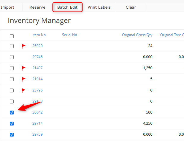 - To make batch edits to inventory items, check off the desired items and select Batch Edit on the top row.