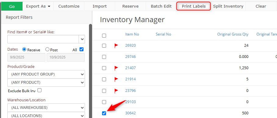 - To print labels of inventory items, check off the desired items and select Print Labels on the top row.