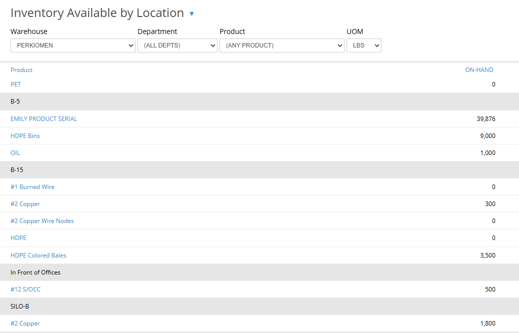 The Inventory Available inquiry can be filtered by Warehouse, Department, and Product. It can be toggled to display in different UOM.