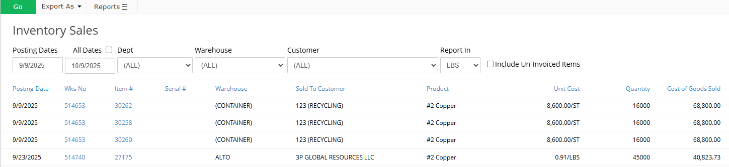 This report provides a listing of all inventory sales activity for a user-specified time period. This report can be run for all Warehouses or for each Warehouse individually. It can also be filtered by Dept, Customer, and you can toggle the UOM using the Report In drop down. Additionally, it has the option to include or exclude Un-Invoiced Items.