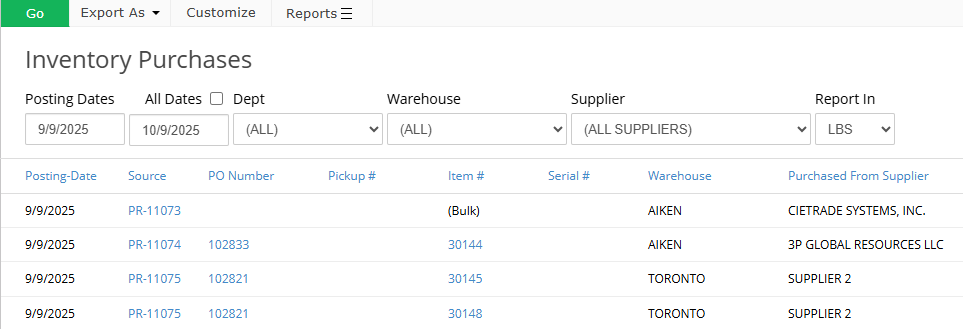This report provides a listing of all inventory purchase activity for a user-specified time period. This report can be run for all Warehouses or for a specific Warehouse. It can also be filtered by Dept, Supplier, and you can toggle the UOM.