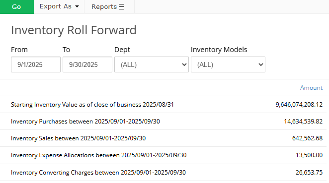The Inventory Roll Forward Report produces a statement of changes in inventory value over a user-specified period. It can be filtered by Dept or by Inventory Model.