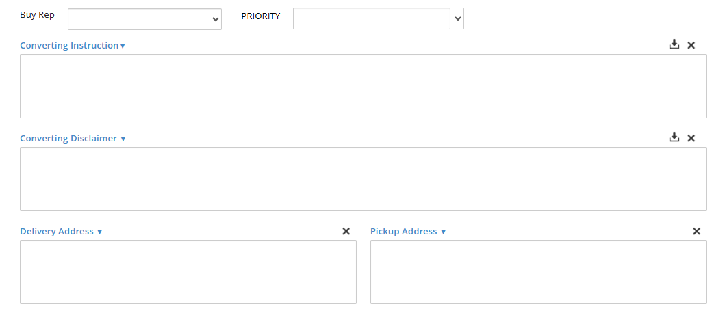 The Converting Instruction and Converting Disclaimer fields allow instructions for the converting job to be entered and saved as templates. These two fields will automatically populate on the Converting Instructions document, which can be given to warehouse employees.