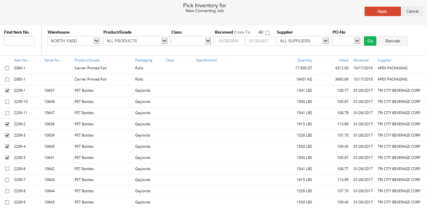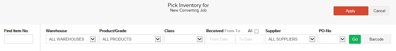 Any combination of filters can be used to locate the needed inventory items. Use the Go button to search using the selected filters. Once search results have been returned, use the check boxes to the left of the inventory item(s) to pick the source stock and then click the Apply button in the top right corner of the page to add the selected item(s) to the Converting Job.