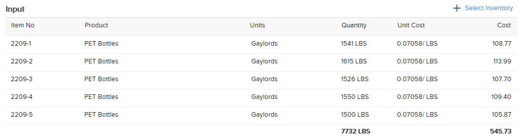 - The Input section identifies the specific inventory items being processed; and