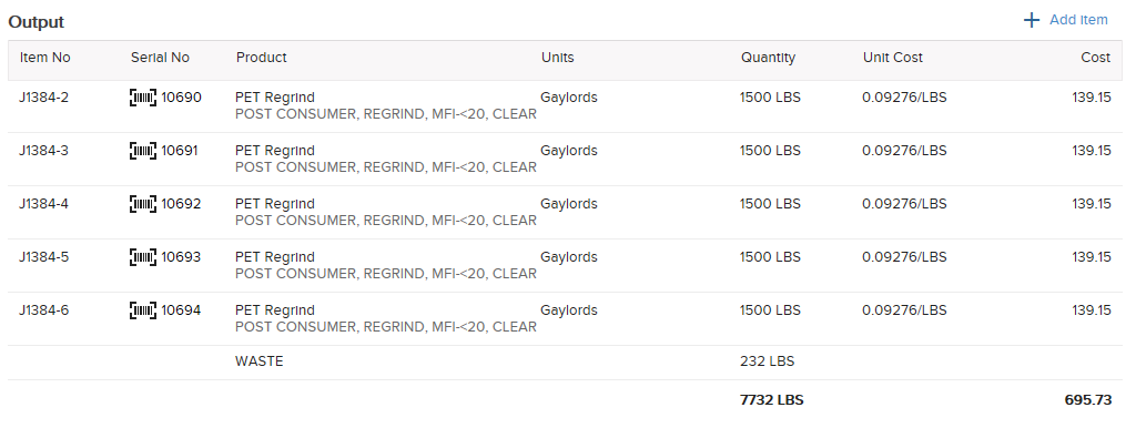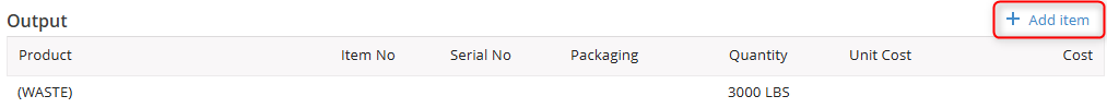 The final step in processing material through the Converting Job is to create your Output items. To add serial Output items to the job, click the Add Item button provided in the Output section.