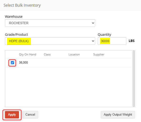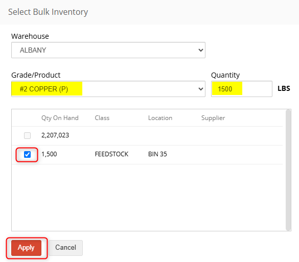 On the Select Bulk Inventory Page, select the Grade/Product to be converted.
