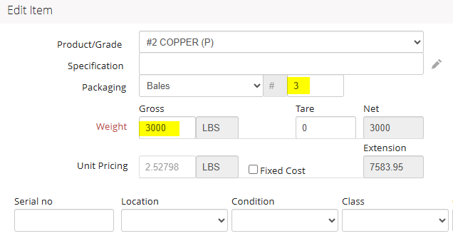 If applicable, use the # field to the right of the Packaging drop-down menu to enter the number of units being produced. Enter the Gross and Tare of the material being received or simply enter the Gross weight to populate the Net Quantity field. The Location, Condition, Class, and Comments are optional fields that may be used to further define the item.
