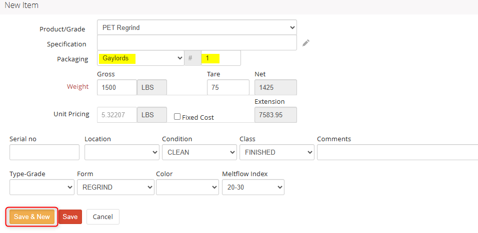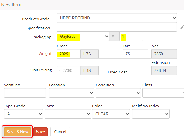 Click Save & New to enter in the weight and specifications of the next item more easily. This will keep the product, packaging type, tare weight and specifications the same for the next lot, to save you time!