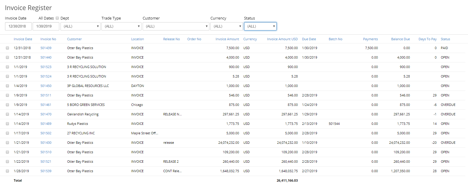 The Invoice Register lists all Customer invoices processed during a user-defined period of time. This report can be run by Department, Trade Type, Customer, or Currency and provides a Total Invoice Amount at the bottom of the transaction list. It can also be sorted by the payment status of the invoice. (Open, Overdue or Paid)